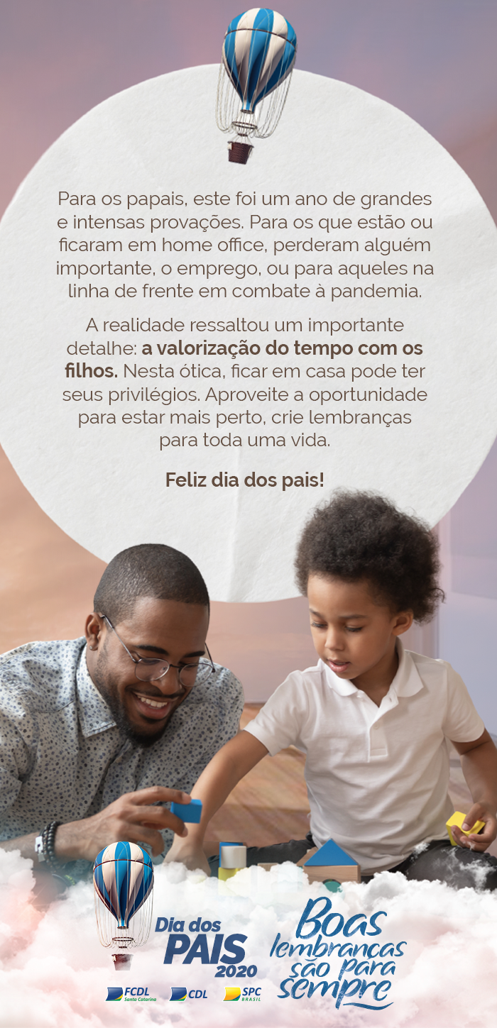Este Dia dos Pais não vai passar despercebido. Um ano de verdadeiras provações para os pais que estão ou ficaram em casa em home office, para os que perderam emprego, para os que tiveram que se arriscar saindo pelas ruas. Em meio a tantos percalços um detalhe ganha uma importância ainda maior: a valorização do tempo com os filhos. Pensando nisso, dentro do contexto em que estamos vivendo, criamos para o seu negócio uma campanha que enaltece as melhores lembranças dos últimos tempos. Aquelas que vão ficar para sempre na memória de pais e filhos. Divulgue as peças nas suas redes sociais e não se esqueça de investir na entrega por delivery. Muitos pais estão em isolamento. Boas vendas. E conte sempre com a gente!