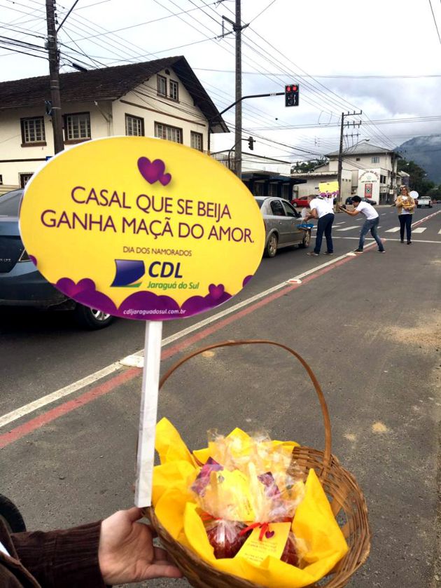 Para enfatizar as comemorações do Dia dos Namorados e alinhada ao conceito da campanha realizada no período, a CDL Jaraguá do Sul promoveu uma intervenção junto aos principais semáforos da cidade. A ação realizada nos dias de Sábado Legal, 4 e 11 de junho, foi embalada por uma trilha musical romântica. Percebida a cada fechamento do sinal, a ação interrompeu a circulação de automóveis nas vias abordadas pela CDL. Então, um promoter identificado, segurando banner, levou a mensagem que instigava casais apaixonados a demonstrarem seu amor por meio de um beijo. Sempre que o objetivo era alcançado, o casal recebeu uma maçã do amor, que carregava a mensagem ‘Amar combina com Presentear’, simbolizando, assim, a promoção do Dia dos Namorados e estimulando à compra do presente. Desse modo, com bom humor e romantismo, fechou-se o ciclo da campanha alusiva ao Dia dos Namorados, apresentando como o amor pode ser doce e ir além da mensagem tradicional. A campanha alcançou 600 casais apaixonados.