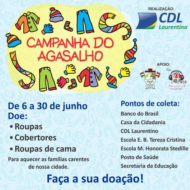 2.300 peças. Esse é o saldo da 3ª edição da Campanha do Agasalho promovida pela CDL Laurentino. O resultado da ação mostra o quanto os moradores do município estão engajados em ajudar o próximo. A campanha foi realizada entre os dias 6 e 30 de junho pela entidade em parceria com a prefeitura e Rádio Alternativa FM. Entre as doações estiveram roupas, calçados e roupas de cama. A arrecadação foi entregue na secretaria municipal de assistência social, que destina esses materiais de forma correta conforme a necessidade do município.