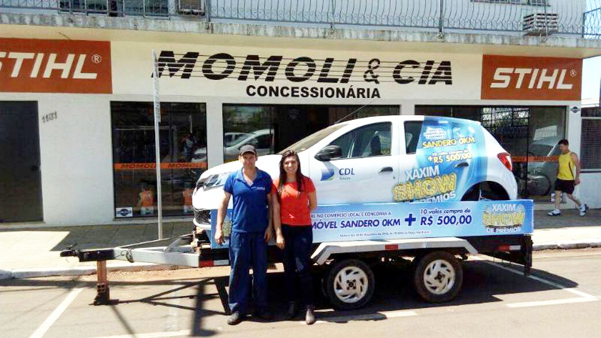 Empresas associadas à CDL Xaxim que participam da campanha ‘Xaxim, um show de prêmios’ estão expondo em frente às lojas o veículo que será sorteado – um Renault Sandeiro 0 quilômetro completo. Além do carro, a entidade também vai sortear 10 vale-compras de R$ 500 cada e prêmios para os atendentes de cada pessoa sorteada. O sorteio acontecerá no dia 30 de dezembro.