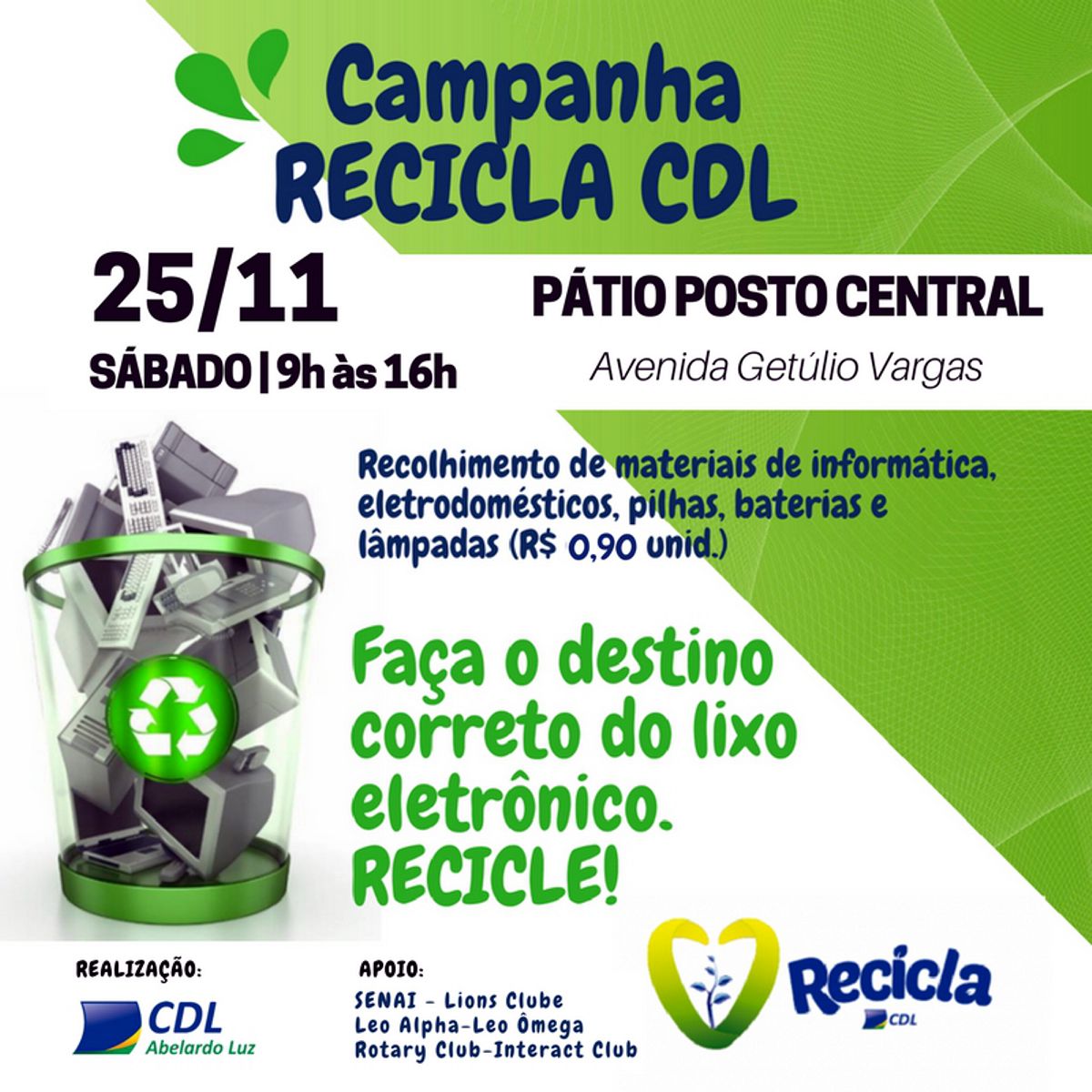 A CDL Abelardo Luz iniciou em novembro mais edição do Recicla CDL. A campanha visa recolher e dar o destino ambientalmente correto a equipamentos de informática, produtos eletroeletrônicos, pilhas, lâmpadas e baterias.