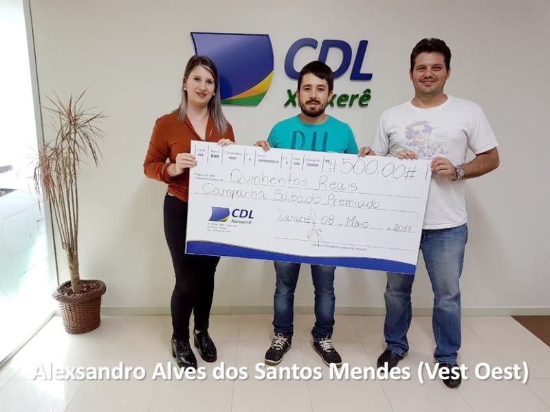 Os ganhadores do sorteio receberam simbolicamente seus cheques na sede da CDL na terça-feira, 8 de maio. Alexsandro Alves dos Santos Mendes, que fez suas compras na Vest Oest, levou o prêmio maior de R$ 500. Sedirlei Roseli Grunintzki Dagort, que fez compras na Ya!Live ganhou um vale-compras no valor de R$ 200. Michele Geroldi (Código Feminino); Adriana Fátima Basso (Mell Moda Infantil); e Eduarda Filipini (Casas Néri Calçados) levaram R$ 100 cada.