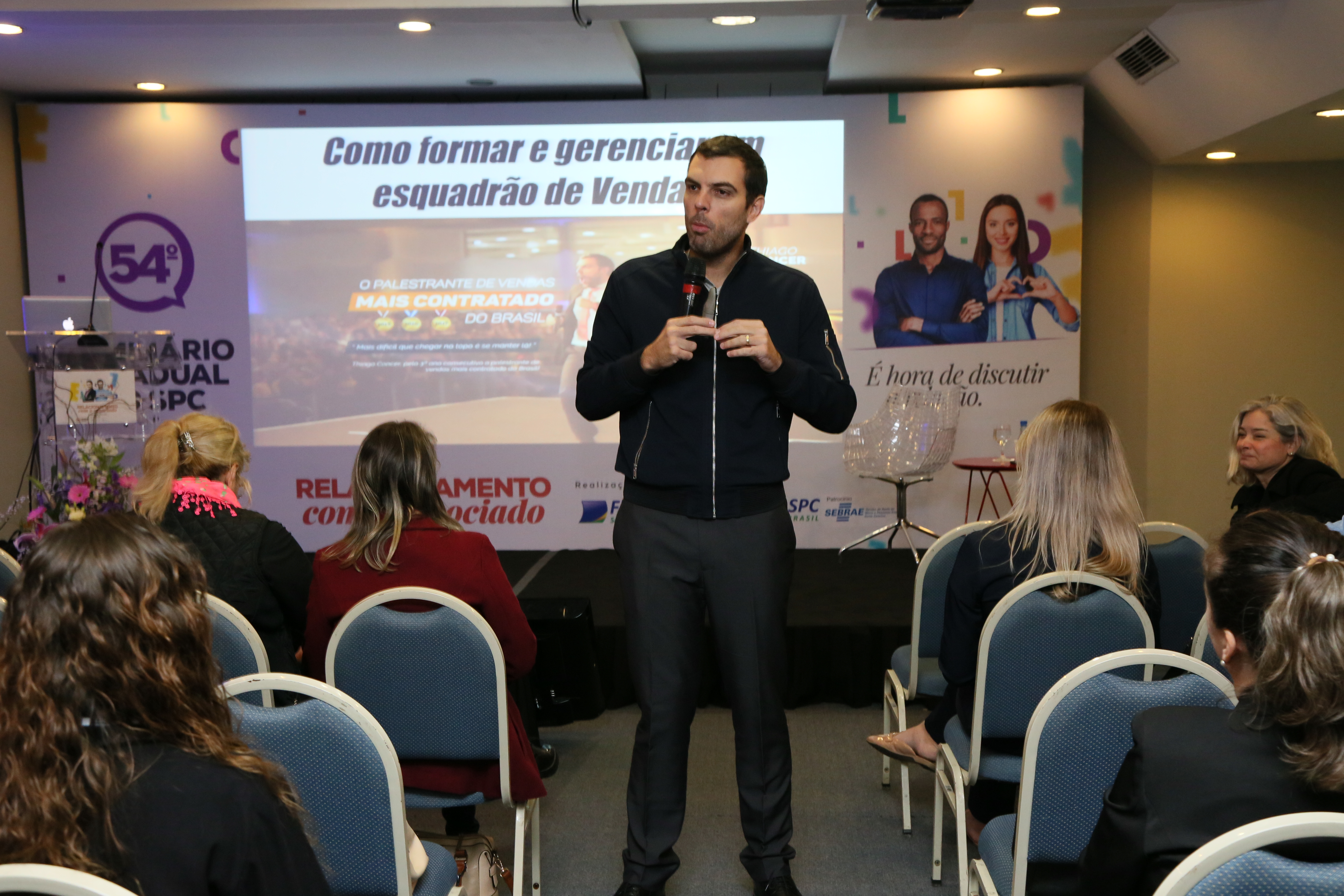 “Quando o assunto é vendas, o aperfeiçoamento constante é indispensável”. É o que ensina, Thiago Concer, que subiu ao palco do Seminário Estadual do SPC em Florianópolis para sua palestra de vendas.
