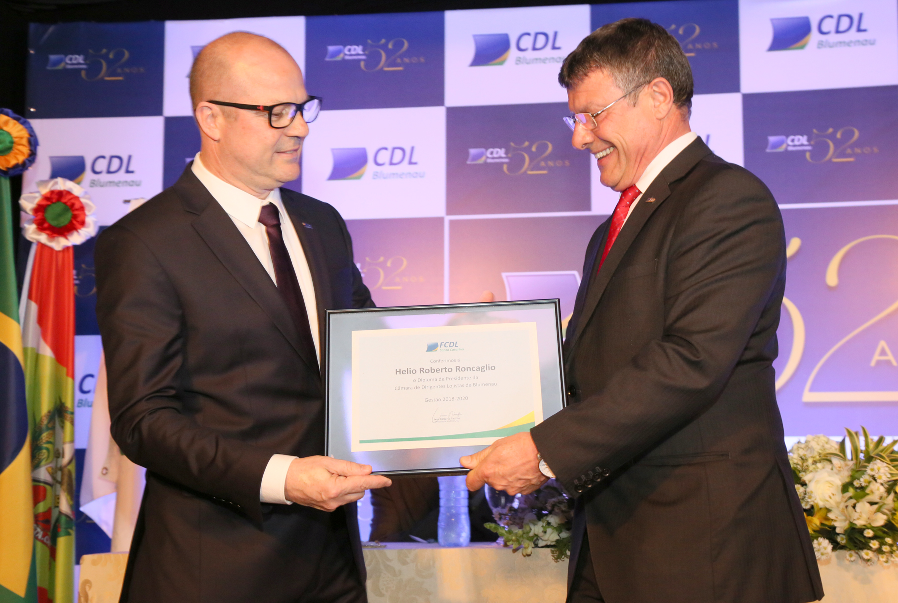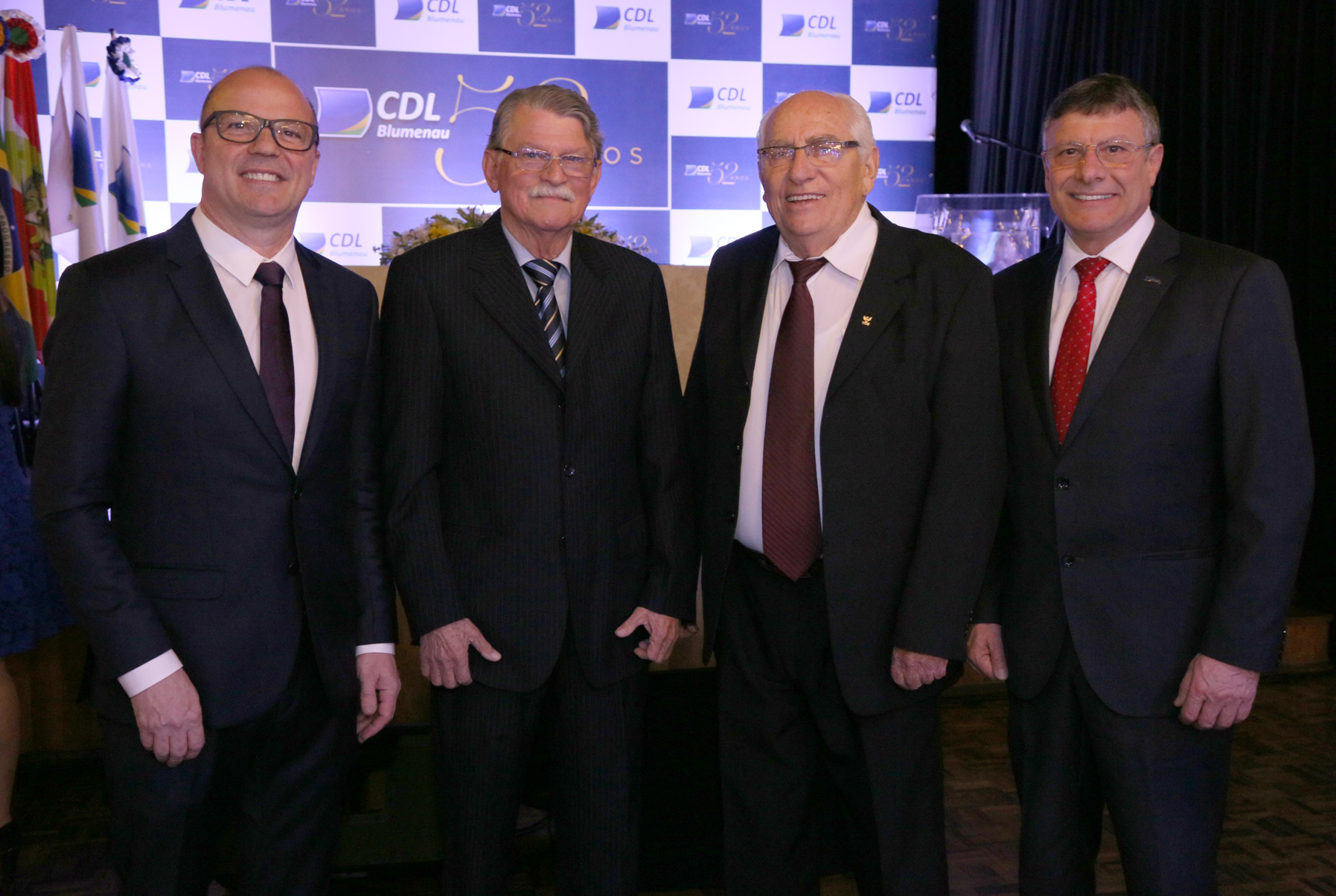 Para celebrar os 52 anos da CDL Blumenau e homenagear todos os grandes líderes da entidade, os ex-presidentes que participaram da solenidade receberam do atual presidente e do vice-presidente da CDL, Eduardo Soares, um cubo comemorativo ao aniversário da entidade.