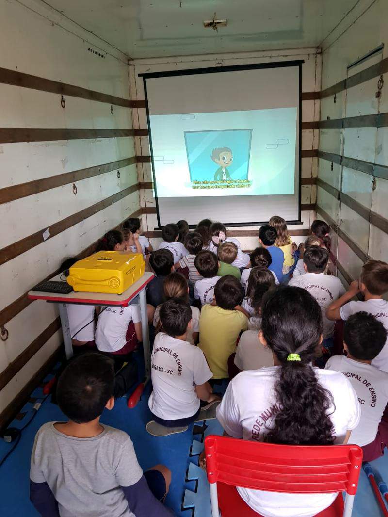 Para ‘montar’ o cinema nas escolas, a CDL Ibirama adaptou um caminhão que conta com um telão para facilitar a visualização dos vídeos.