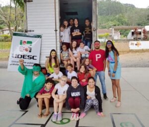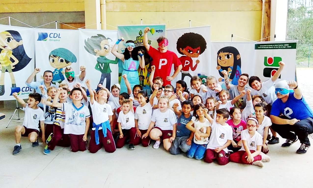 “As crianças adoraram. Entraram na onda, quiseram bater foto com os personagens, acreditaram que eles vieram de outro planeta. Foi muito legal e a ação cumpriu seu objetivo”, comemora a gestora da entidade, Marlete Dopke. “Para os alunos do 6º ao 9º, além dos vídeos da Liga, passamos outro, com mais dados e informações sobre o consumo consciente”, completa. Os estudantes da Udesc foram parceiros da ação e se vestiram dos personagens da Liga.