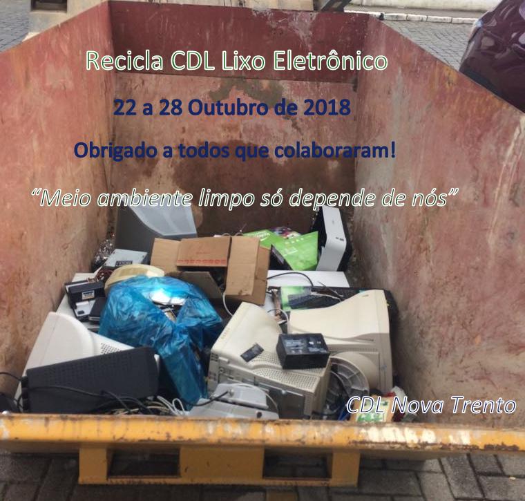 O projeto Recicla CDL movimentou a cidade de Nova Trento entre os dias 22 e 28 de outubro. Moradores da região foram até a Câmara de Dirigentes Lojistas (CDL) para levar monitores de computador, CPUs, impressoras, lâmpadas, aparelhos de telefone fixo, celulares, pilhas e baterias, cabos, roteadores, entre outros objetos. Uma empresa especializa no manejo deste tipo de resíduos recolheu os materiais para tratamento ambientalmente correto.