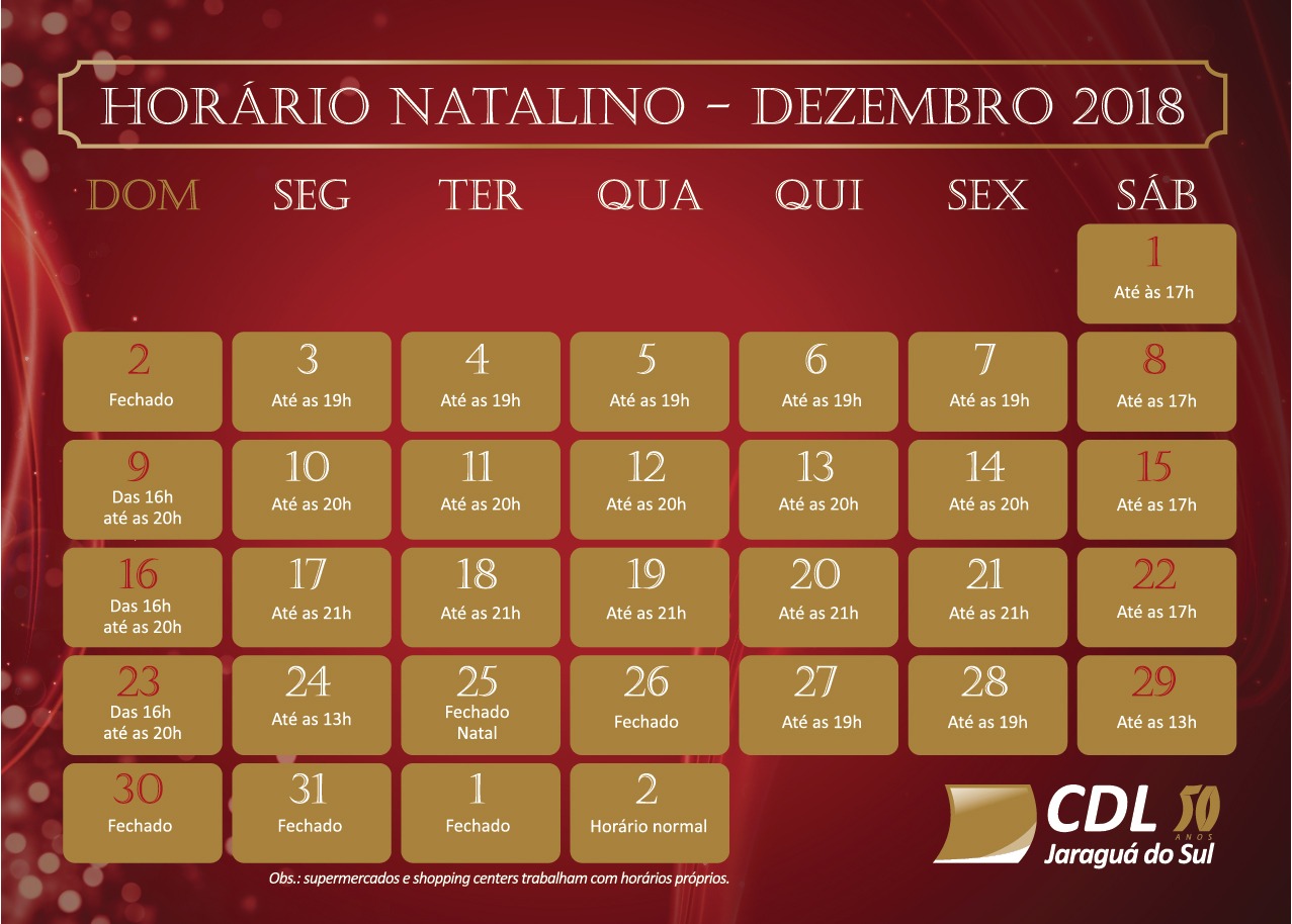 Em Jaraguá do Sul, para atender às demandas dos consumidores da microrregião, o comércio iniciou no dia 1º de dezembro o horário natalino. Na primeira semana de dezembro, as lojas estendem o atendimento até as 19h. Depois, entre os dias 10 e 14, fecham às 20h e, de 17 a 21 somente às 21h. Aos sábados, o funcionamento será até 17h e, nos domingos, com exceção do dia 2, das 16h às 20h. Além disso, na véspera de Natal, os clientes poderão fazer suas compras das 8h30 às 13h. Nos dias 2, 25, 26, 30, 31 e 1, o comércio estará fechado.
