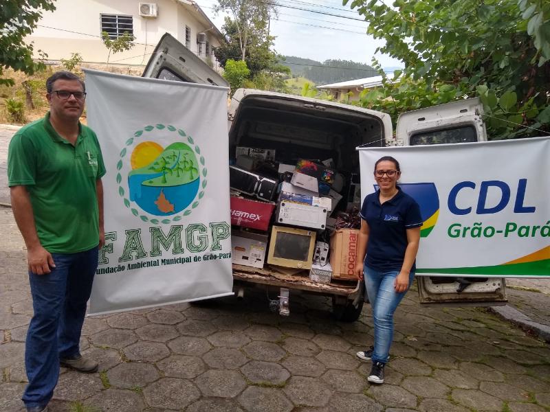 Os moradores de Grão Pará contaram com mais uma oportunidade para descartar resíduos eletrônicos. É que a Câmara de Dirigentes Lojistas da cidade promoveu a última ação do ano do Recicla CDL na quarta-feira, 12 de dezembro. Foram coletados eletroeletrônicos, pilhas e baterias e óleo de cozinha usado. Durante as três datas de mobilização da iniciativa em 2018, a entidade conseguiu arrecadar aproximadamente 350 quilos de eletroeletrônicos, 300 pilhas e baterias e mais de 100 litros de óleo de cozinha usados. A CDL contou com o apoio da FAMGP (Fundação do Meio Ambiente de Grão Pará) na execução do projeto no município.