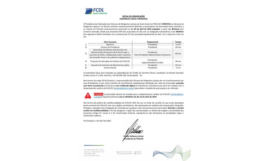 Clique no link abaixo e faça download do Edital de Convocação da Assembleia Geral Ordinária da FCDL/SC