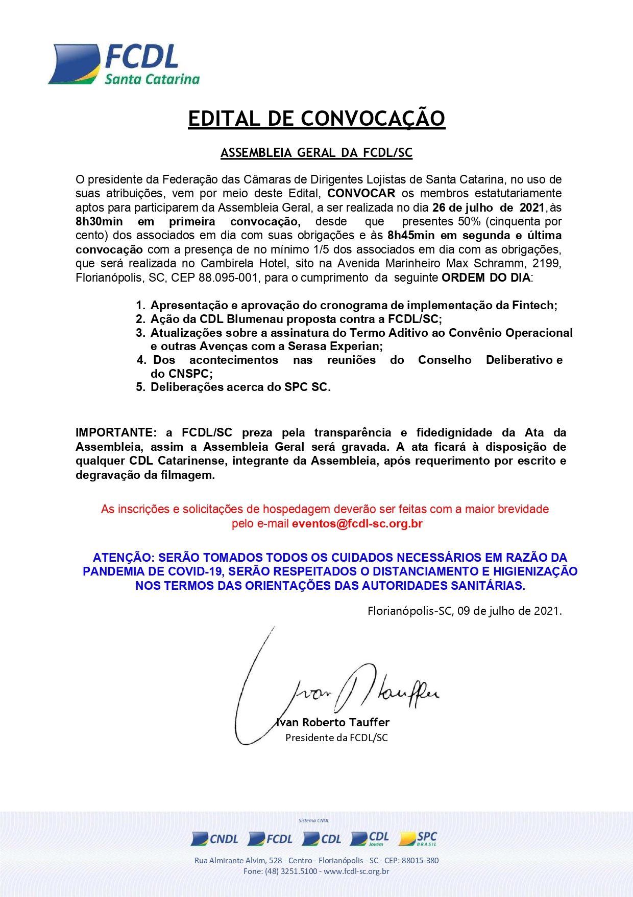O Presidente da Federação das Câmaras de Dirigentes Lojistas de Santa Catarina (FCDL/SC) CONVOCA as Câmaras de Dirigentes Lojistas e os demais membros estatutariamente definidos a participarem de Assembleia Geral Extraordinária a se realizar em formato exclusivamente online no dia 30 de novembro de 2023 (quinta-feira), a partir das 18h45min (em primeira chamada, desde que presentes 50% dos associados em dia com as obrigações estatutárias) e das 19h (em segunda e última chamada, com a presença de 1/5 dos associados igualmente em dia).